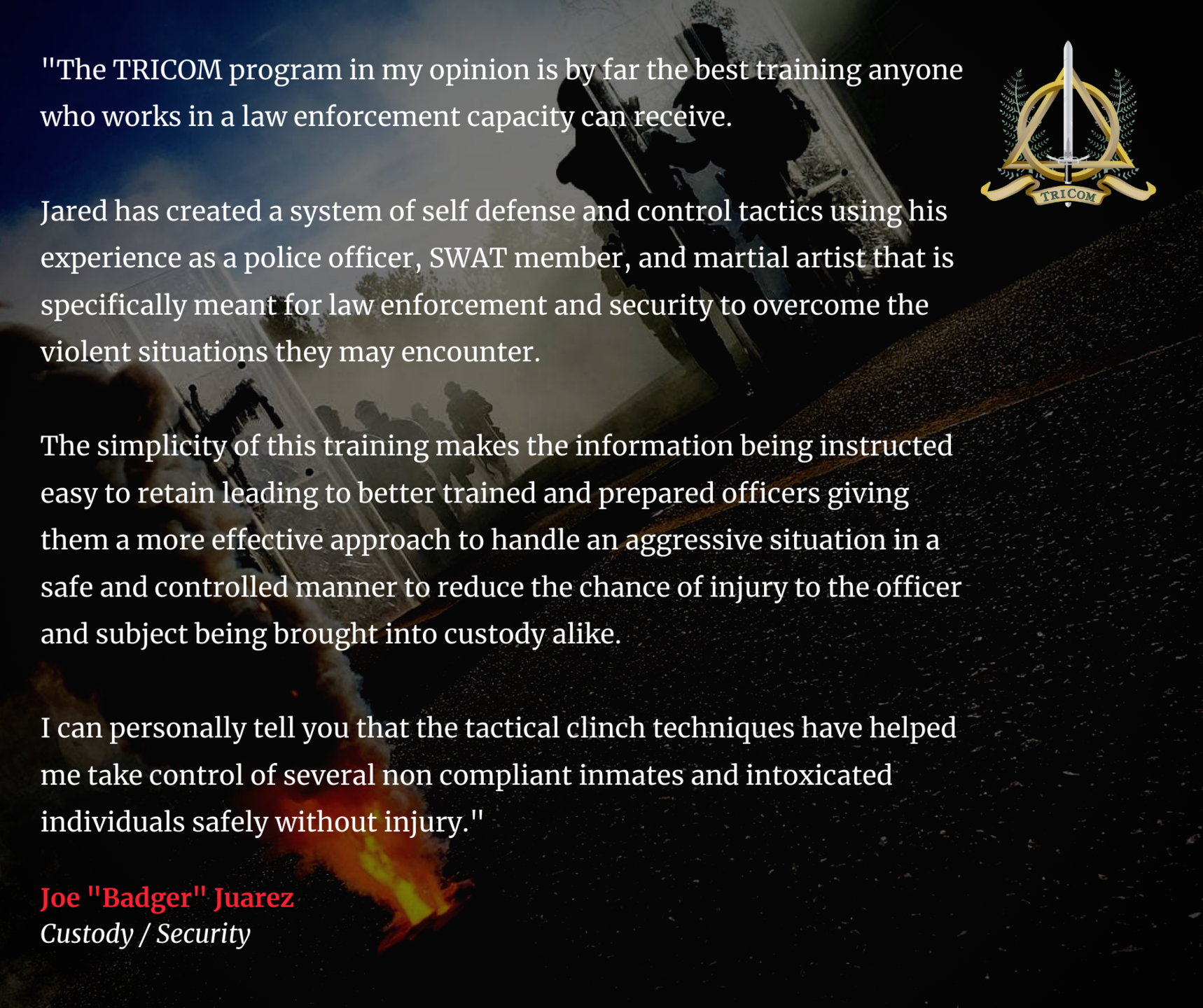 The TRICOM system was developed over decades of Martial Arts training, then put through the filter of real-world experience as a nightclub bouncer, followed by years as a street cop and SWAT Operator. It was then refined through decades of teaching as a full-time Police Academy Defensive Tactics Instructor, U.S. Army Special Forces Combatives Instructor, and traveling the world working close-protection contracts, and training Special Operations Forces and defense minded civilians. Â